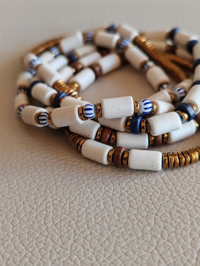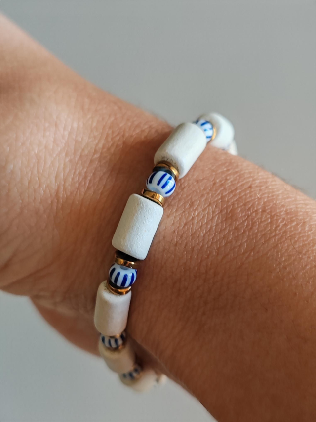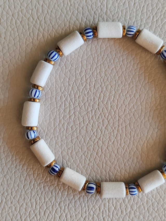 Bracelet composé de pièces en céramique mate couleur craie / blanche, et de perles heishi en hématite dorées, surmontées de perles de rocailles rayées bleue et blanche, montées sur un fil extensible pour plus de confort.