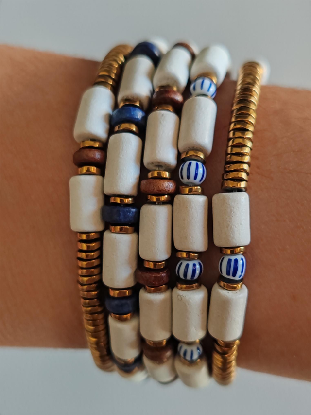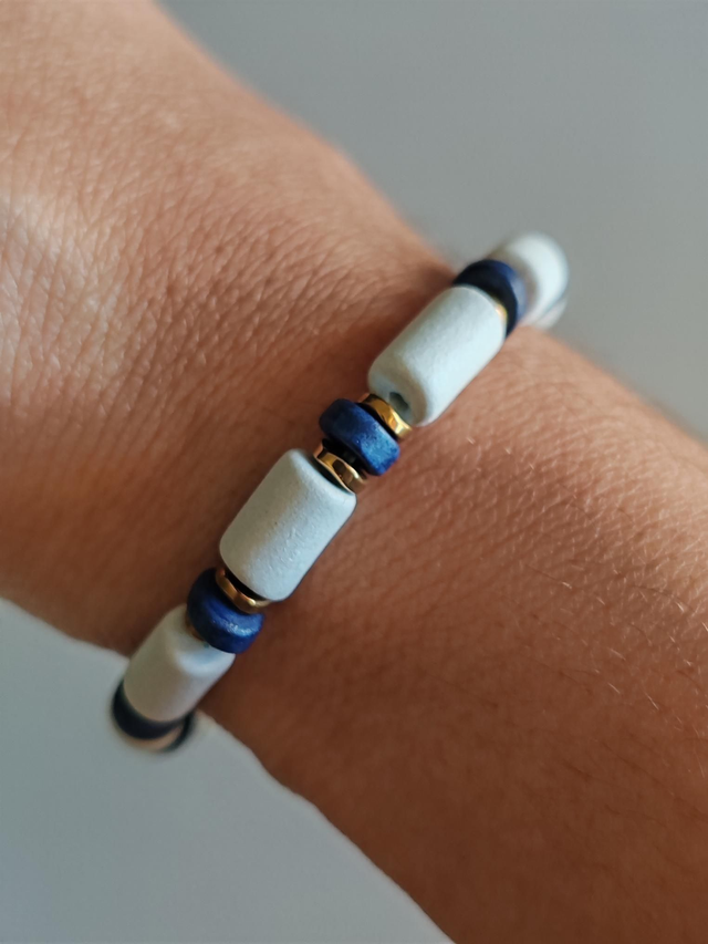 Bracelet composé de pièces en céramique mate couleur craie / blanche, et de perles heishi en hématite dorées, surmontées de fines pièces en céramique bleue indigo, montées sur un fil extensible pour plus de confort.