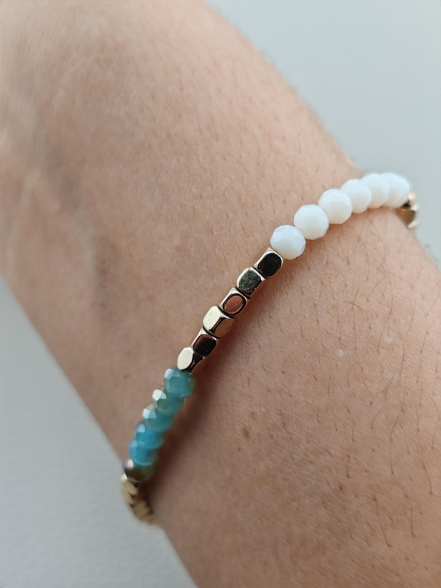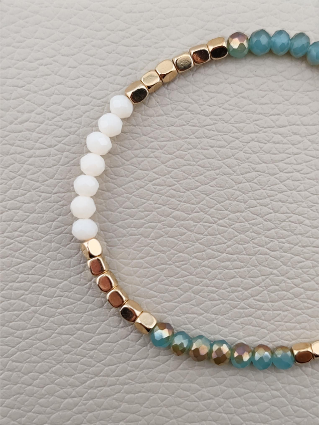 Bracelet composé de perles de rocailles vert turquoise aux reflets bronze, et blanches ainsi que de perles en hématite dorées et montées sur un fil extensible pour plus de confort.